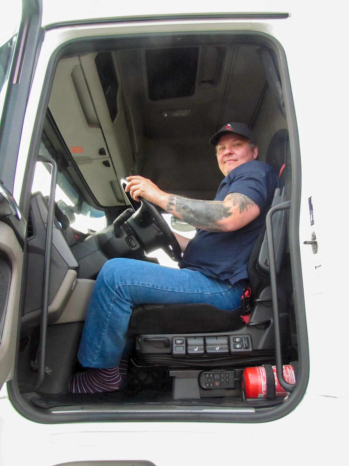 Kokemäeltä kotoisin oleva Tomi Hiukka on ehtinyt tehdä auton ratissa työpäivän jos toisenkin. Jo ennen kuin hän 25-vuotiaana hankki itselleen E-kortin, oli hän C-kortin turvin ajellut kuorma-autolla pullaa Harjavallan torille. Transpointilla hän ajoi jakeluautoa, kun ei vielä päässyt peräkärryllistä ohjaamaan.