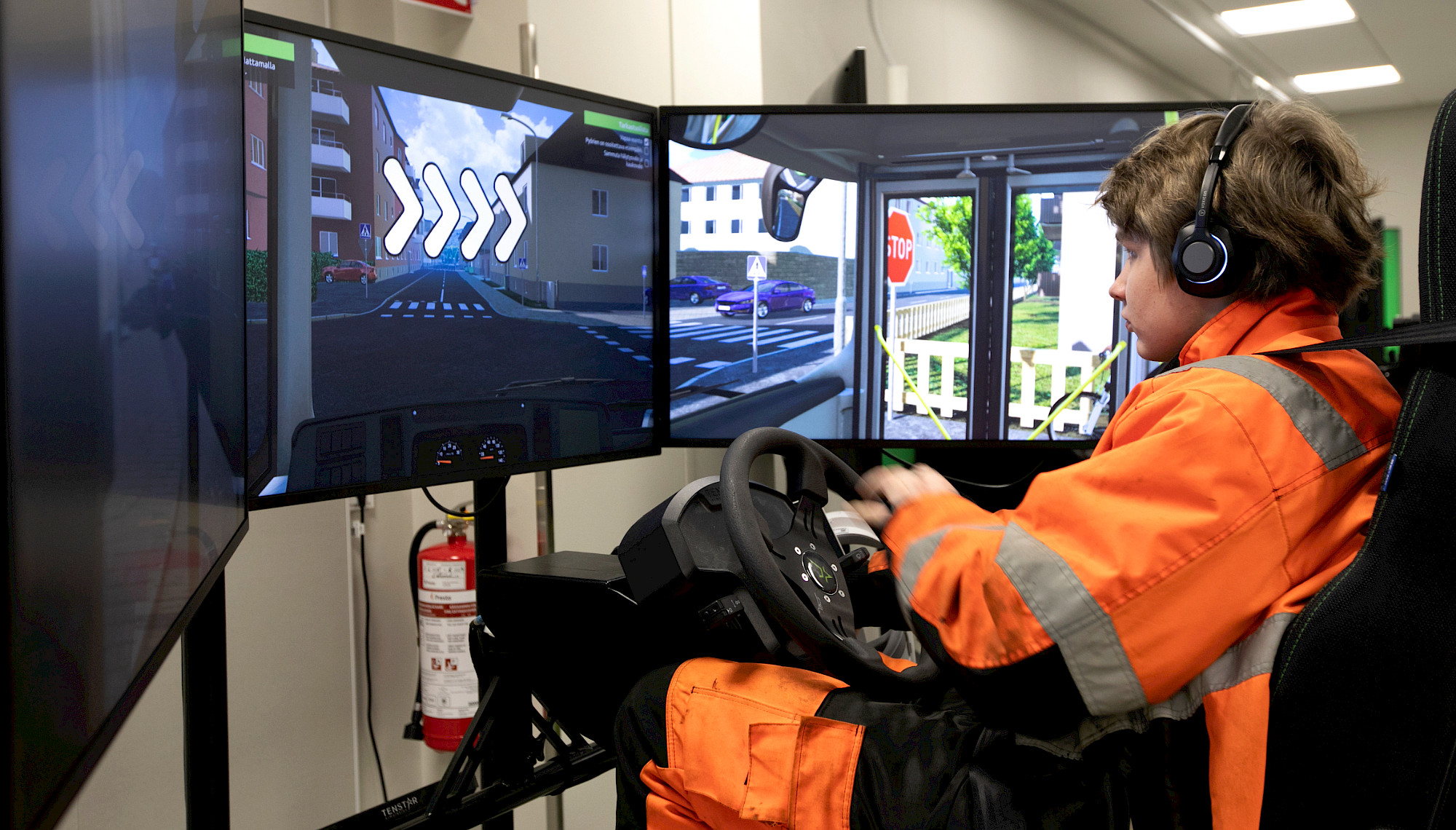 Osku Uusitalo ajosimulaattorin ratissa; simulaattori tarjoaa alaikäisillekin opiskelijoille mahdollisuuden kokea aito liikenneympäristö.